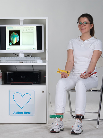 - Beim HERZ-CHECK (ab 21 Jahren) werden Elektroden an Händen und Füßen angebracht. (Achtung: Keine Strümpfe, Messung muss auf der Haut sein!).