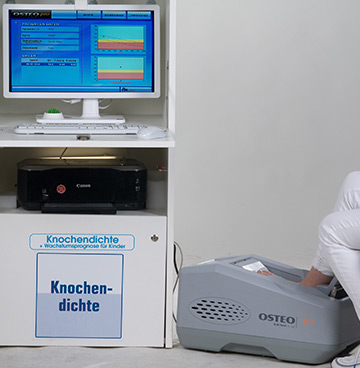 Die Knochendichte wird mit Ultraschallwellen gemessen und es wird dabei die maximale Festigkeit des Knochens ermittelt.